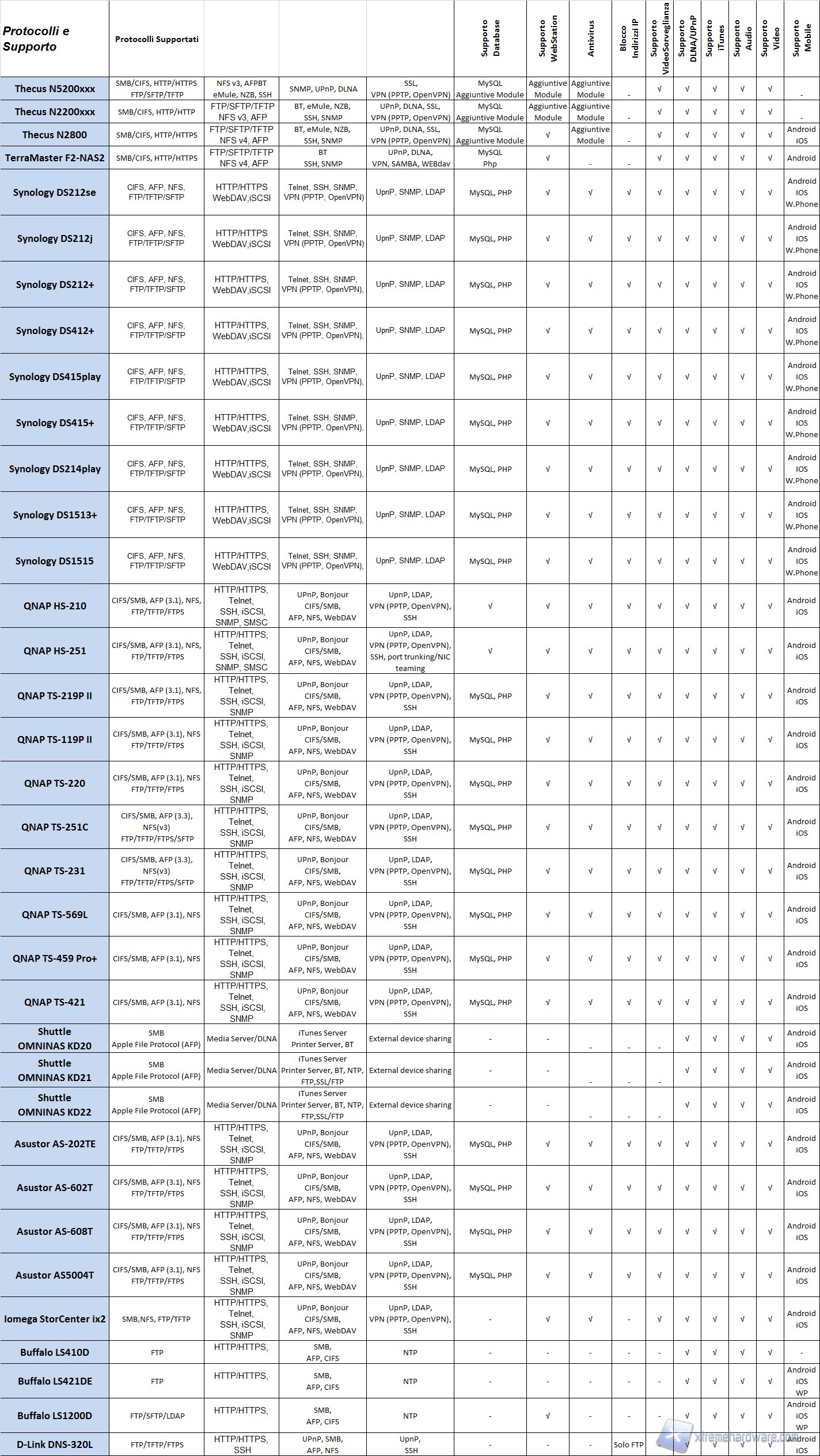 Riportiamo, inoltre, la tabella comparativa delle caratteristiche principali di tutti i NAS recensiti e testati per voi fino ad ora.