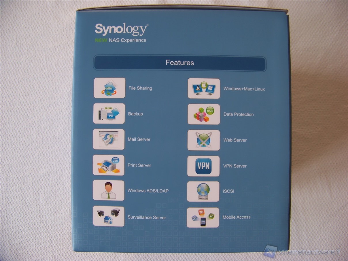 Come per il Synology Ds212j, anche la scatola di questo modello è dotata di maniglia atta al trasporto, possiamo trovarla nella parte superiore della confezione.
