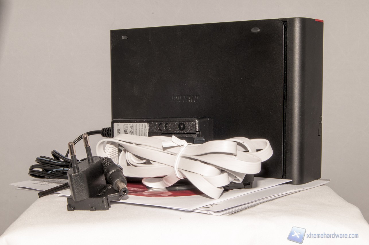 All'interno della confezione troviamo, oltre al LinkStation LS410D, un cavo di rete flat RJ-45 bianco, l'alimentatore con 2 adattatori relativi alla presa elettrica, se standard o inglese, manuali utente ed un CD contenete il software e la documentazione digitale.
