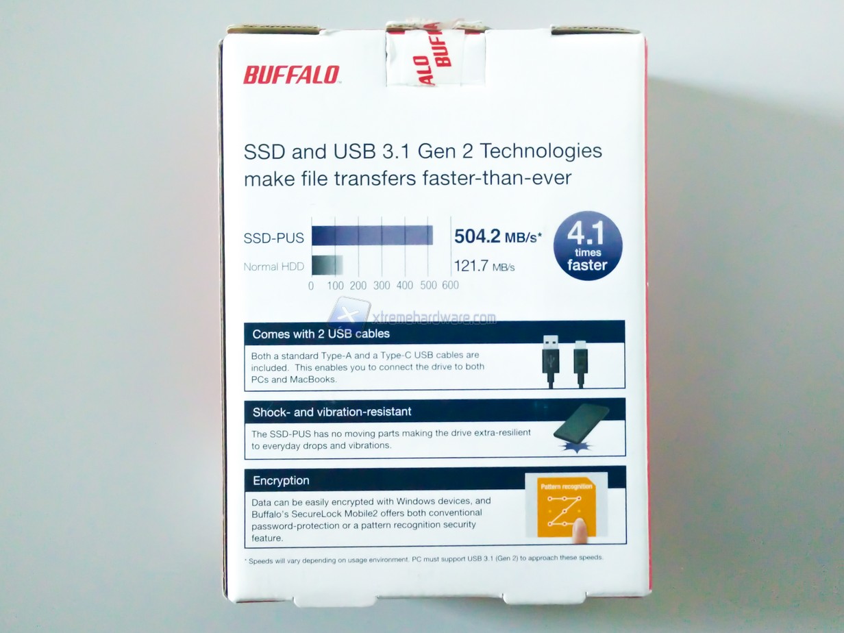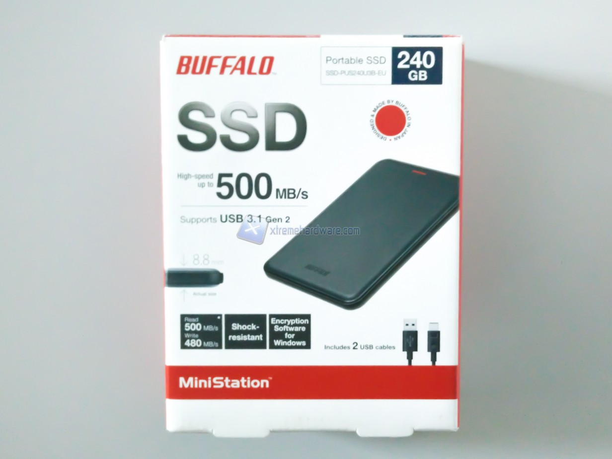 Il Buffalo SSD-PUSU3 viene venduto all’interno della classica confezione con la quale Buffalo ci ha abituato ad avere a che fare; numerose informazioni stampate su un box di cartone dai colori aziendali, bianco e rosso.