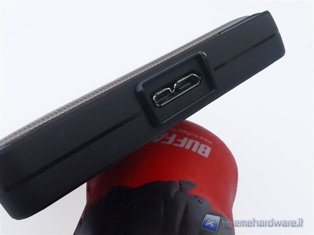 La Buffalo MiniStation Plus è esteticamente abbastanza semplice. Nella parte superiore spicca il particolare rivestimento che cambia in base alla colorazione scelta, mentre nella parte posteriore, oltre alla porta Micro USB 3.0 di tipo B, troviamo una spia luminosa che cambierà colore a seconda della connessione utilizzata: blu per la USB 3.0 e verde per la USB 2.0.