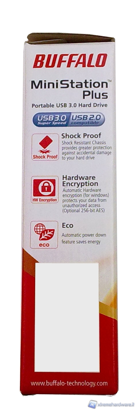 La Buffalo MiniStation Plus viene venduta all'interno di una scatola di cartone dalle dimensioni di 170x40x125 mm. Esteticamente non è molto appariscente e la presenza di molte informazioni relative alle tecnologie utilizzate la rendono molto professionale. Nella parte frontale della confezione troviamo una immagine della MiniStation Plus che cambia a seconda della colorazione del drive scelto. In basso a sinistra, inoltre, un bollino ci informa sulla capacità e sulla colorazione; nel nostro caso il bollino riporta le scritte 500GB e Silver. Sono inoltre presenti informazioni relative allo chassis resistente agli urti, al sistema di crittografia ed alla connessione utilizzata.