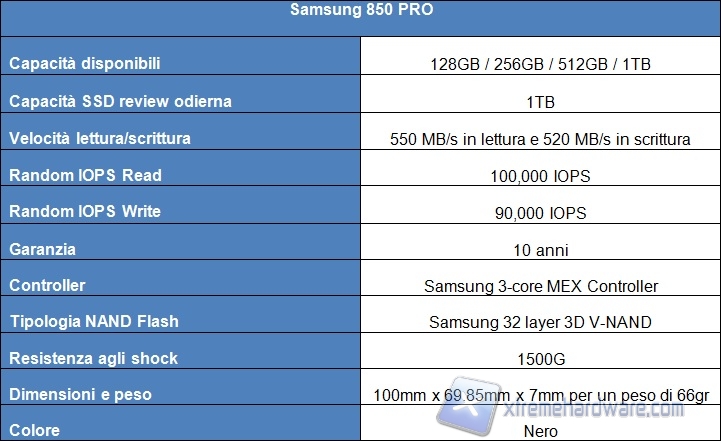 Il Samsung 850 PRO è disponibile in diversi tagli, infatti si va dal più piccolo che è da 128GB, utile solamente per l’installazione del SO e qualche programma, fino al capiente che è da 1TB, che è possibile usarlo benissimo come unico disco del nostro PC data l’elevata capacità. Come possiamo vedere sono stati eliminati dal listino il taglio 64GB, sostituito ormai nella fascia bassa dal taglio da 128GB. Le prestazioni degli SSD variano anche in base alla sua capacità: in tabella abbiamo riportate quelle relative al modello da 1TB. Sappiate comunque che le prestazioni dichiarate da Samsung per il modello da 128GB non si discostano di molto da quelle degli altri tre modelli (unica differenza la velocità di scrittura che passa da 520MB/s a 470 MB/s.