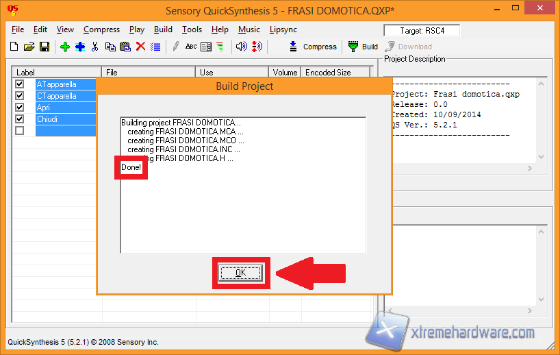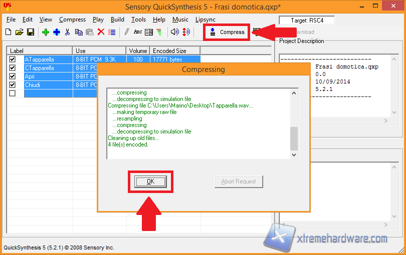 Adesso passiamo a comprimere tutte le frasi inserite nel nostro progetto. Quindi, selezioniamo tutto (CTRL+A) e clicchiamo sul tasto “Compress”. In seguito vi apparirà una schermata con delle scritte che diventeranno verdi non appena l’operazione verrà completata senza problemi (in caso contrario assicuratevi che il programma sia stato avviato con le priorità di amministratore).