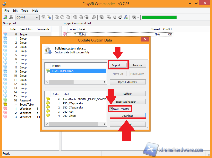 Se tutto è andato a buon fine, clicchiamo su “Download” per avviare il trasferimento e caricare finalmente le nostre frasi nel’ EasyVR.